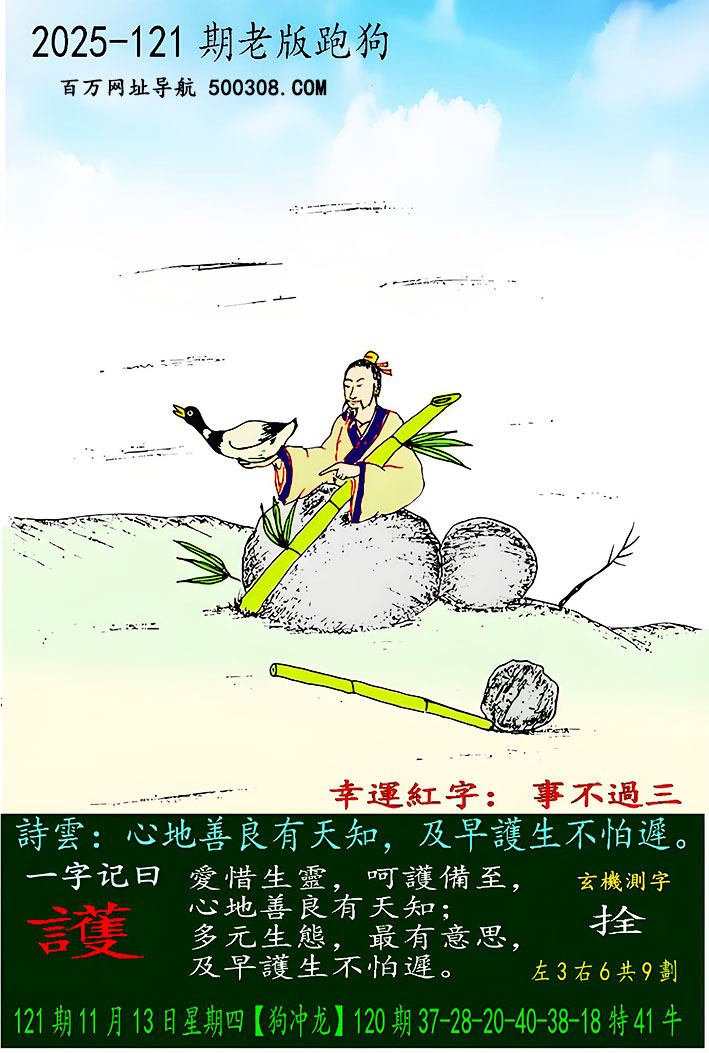 134期跑狗图:一字記之曰:【哺】 逢下蔭涼,母側雛藏。 啄蟲哺飼,咕咕輕喚。玄機測字:《純》 一語中特:九死一生